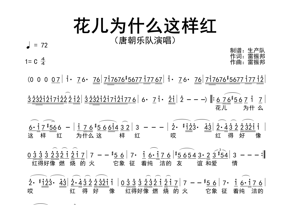 《花儿为什么这样红》是唐朝乐队演唱的一首歌曲,简谱,拍号为4/4拍,歌曲速度为每分钟72拍,这份简谱共有一张高清图谱,图谱由 @生产队 编配上传唐朝乐队演唱的歌曲《花儿为什么这样红》简谱。