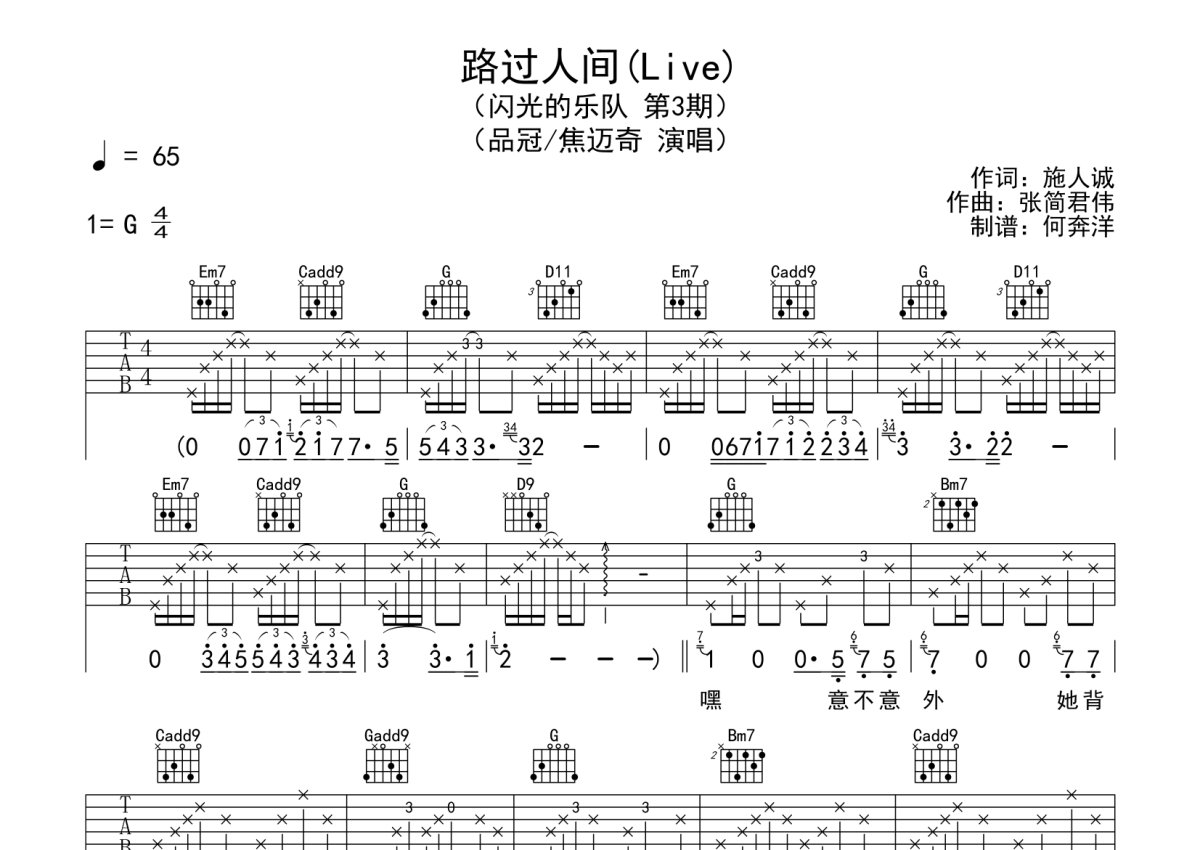 品冠&焦迈奇《路过人间》吉他谱 - G调弹唱六线谱