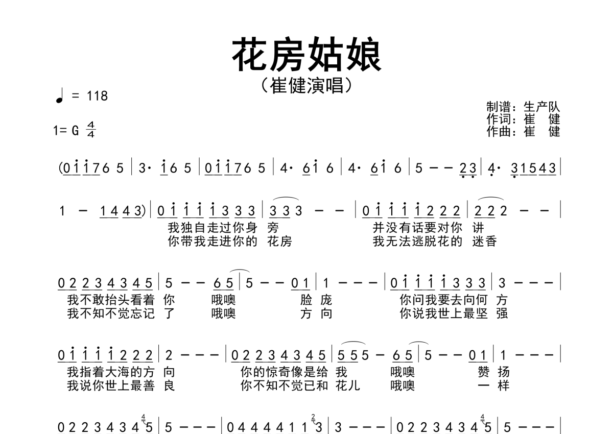 《花房姑娘》是崔健演唱的一首歌曲,简谱,拍号为4/4拍,歌曲速度为每分钟118拍,这份简谱共有一张高清图谱,图谱由 @生产队 编配上传崔健演唱的歌曲《花房姑娘》简谱。
