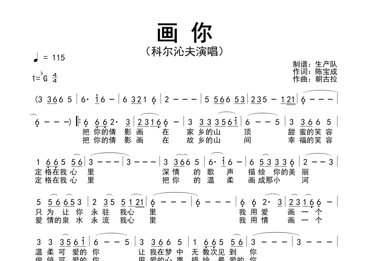 《画你》是科尔沁夫演唱的一首歌曲,简谱,拍号为4/4拍,歌曲速度为每分钟115拍,这份简谱共有一张高清图谱,图谱由 @生产队 编配上传科尔沁夫演唱的歌曲《画你》简谱。