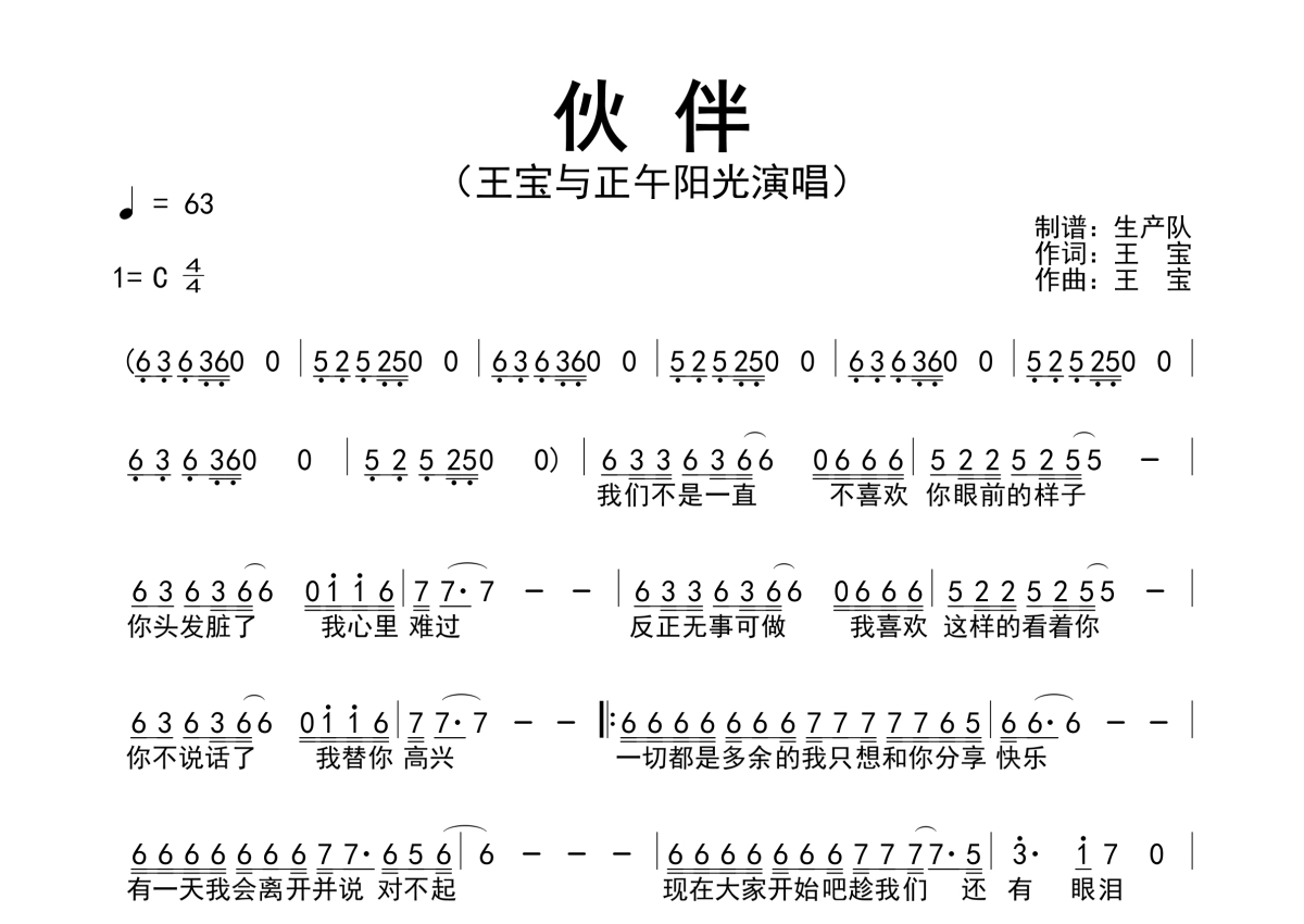 《伙伴》是王宝与正午阳光演唱的一首歌曲,拍号为4/4拍,歌曲速度为每分钟63拍,这份简谱共有一张高清图谱,图谱由 @生产队 编配上传王宝与正午阳光演唱的歌曲《伙伴》简谱。