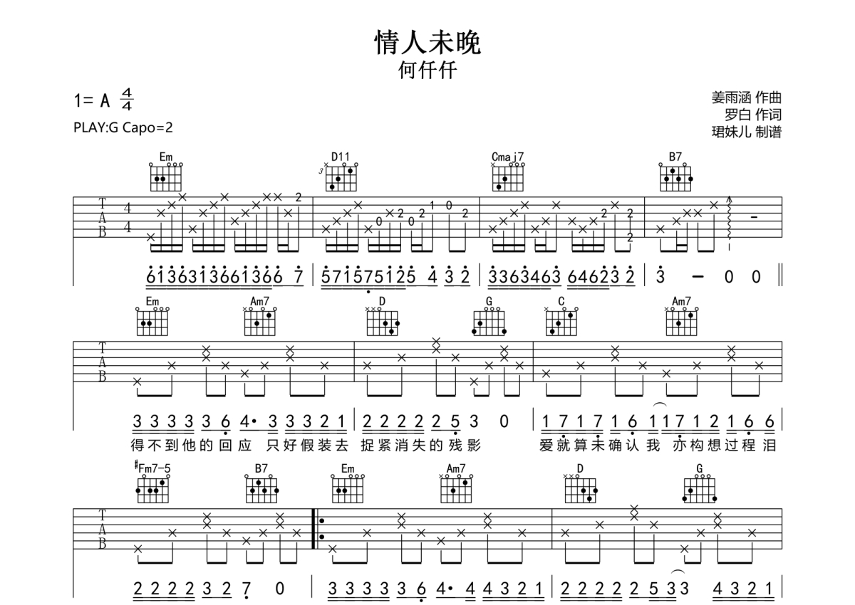 情人未晚吉他谱 - 何仟仟 - G调弹唱六线谱