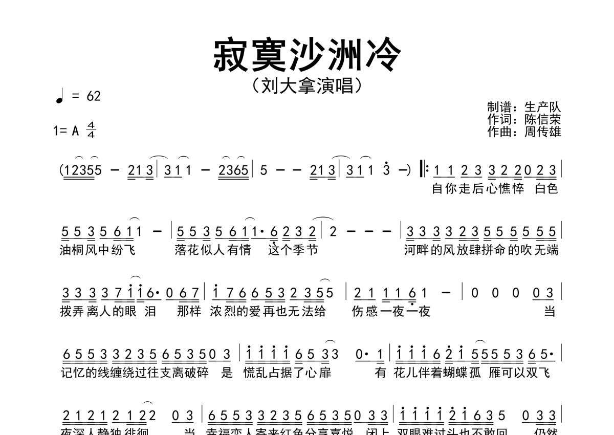 《寂寞沙洲冷》是刘大拿演唱的一首歌曲,简谱,拍号为4/4拍,歌曲速度为每分钟62拍,这份简谱共有一张高清图谱,图谱由 @生产队 编配上传刘大拿演唱的歌曲《寂寞沙洲冷》简谱。