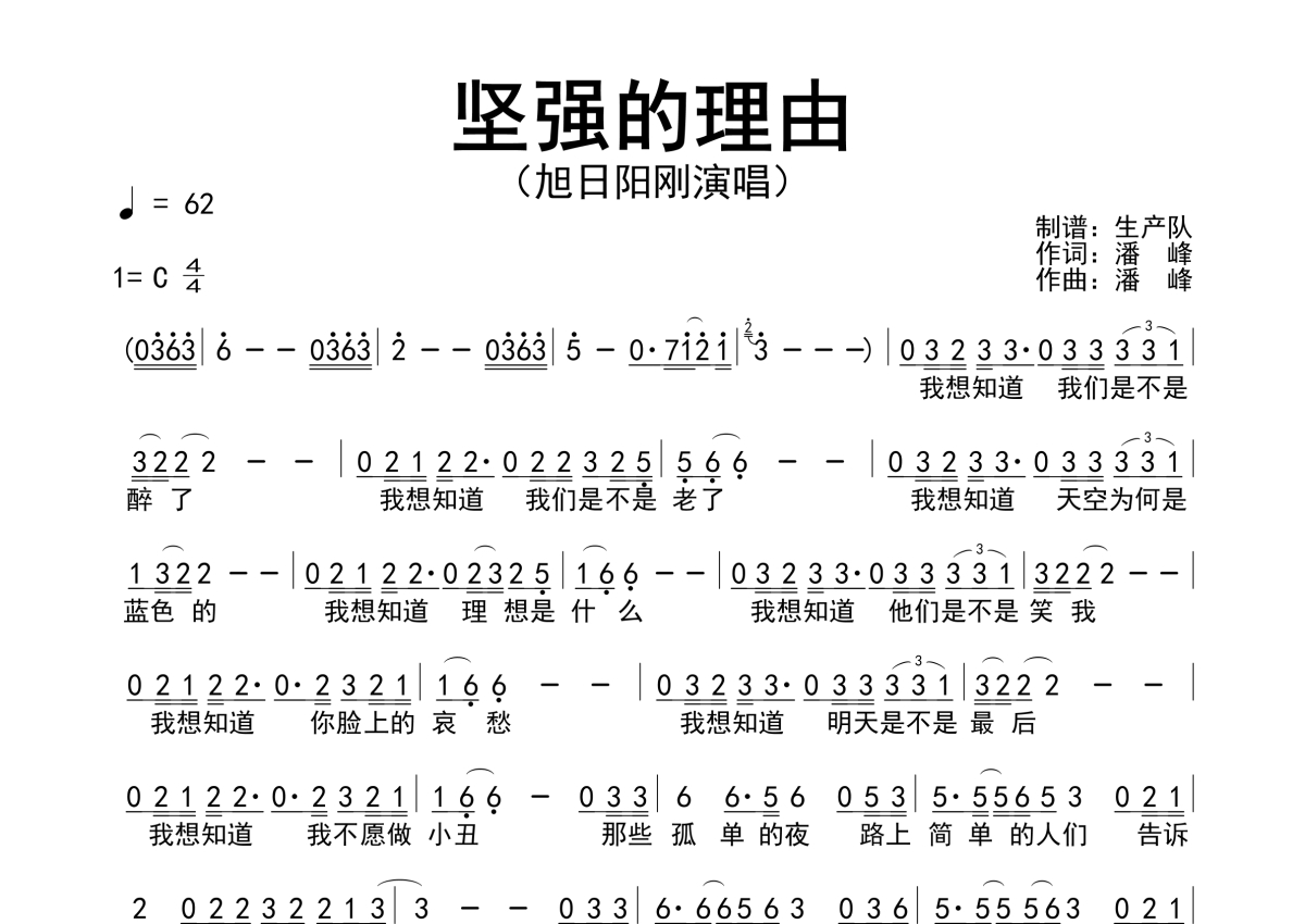 《坚强的理由》是旭日阳刚演唱的一首歌曲,简谱,拍号为4/4拍,歌曲速度为每分钟62拍,这份简谱共有一张高清图谱,图谱由 @生产队 编配上传旭日阳刚演唱的歌曲《坚强的理由》简谱。