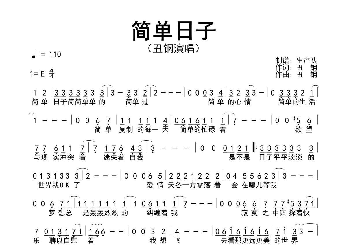 《简单日子》是丑钢演唱的一首歌曲,简谱,拍号为4/4拍,歌曲速度为每分钟110拍,这份简谱共有一张高清图谱,图谱由 @生产队 编配上传丑钢演唱的歌曲《简单日子》简谱。