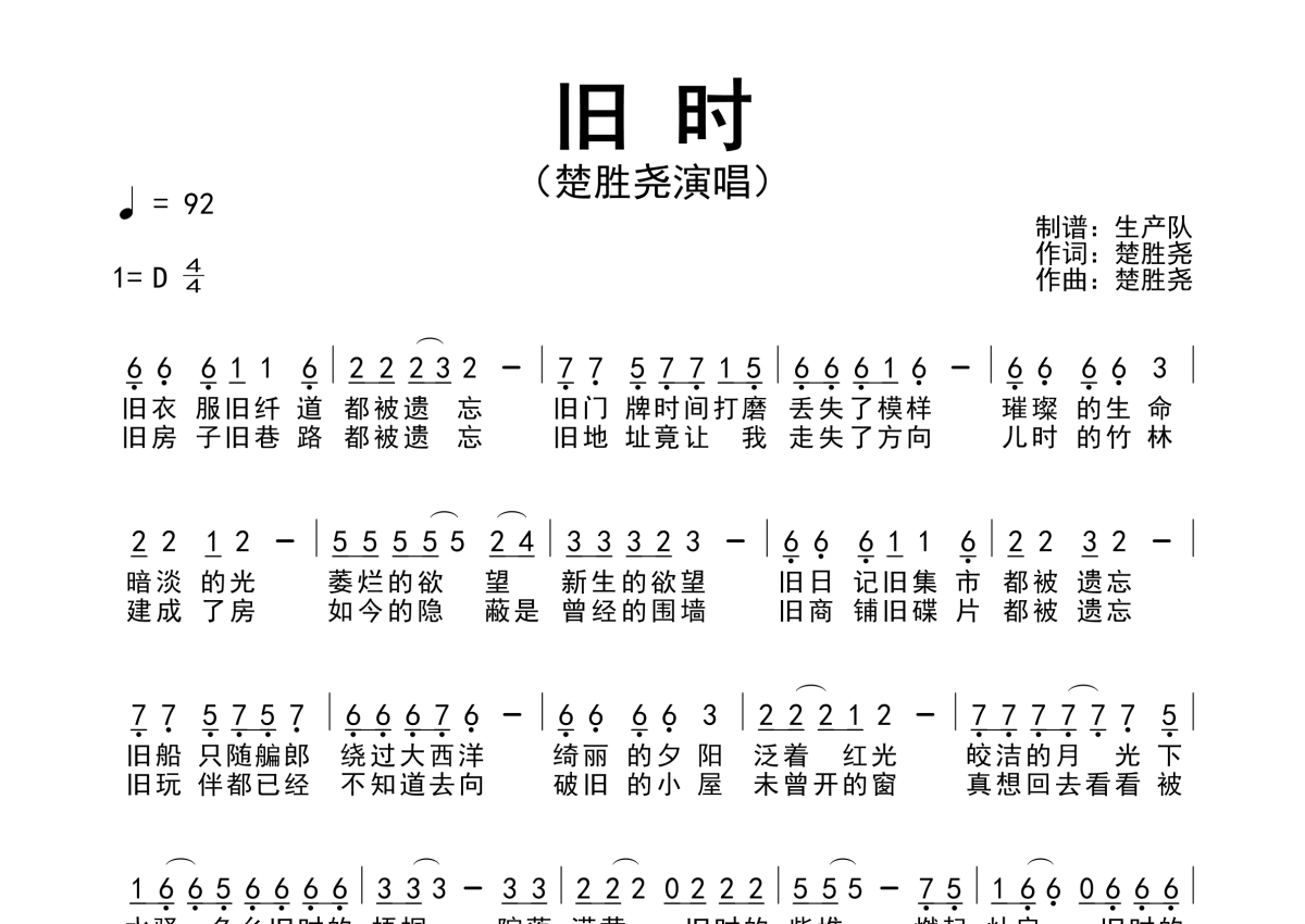 《旧时》是楚胜尧演唱的一首歌曲,简谱,拍号为4/4拍,歌曲速度为每分钟92拍,这份简谱共有一张高清图谱,图谱由 @生产队 编配上传楚胜尧演唱的歌曲《旧时》简谱。