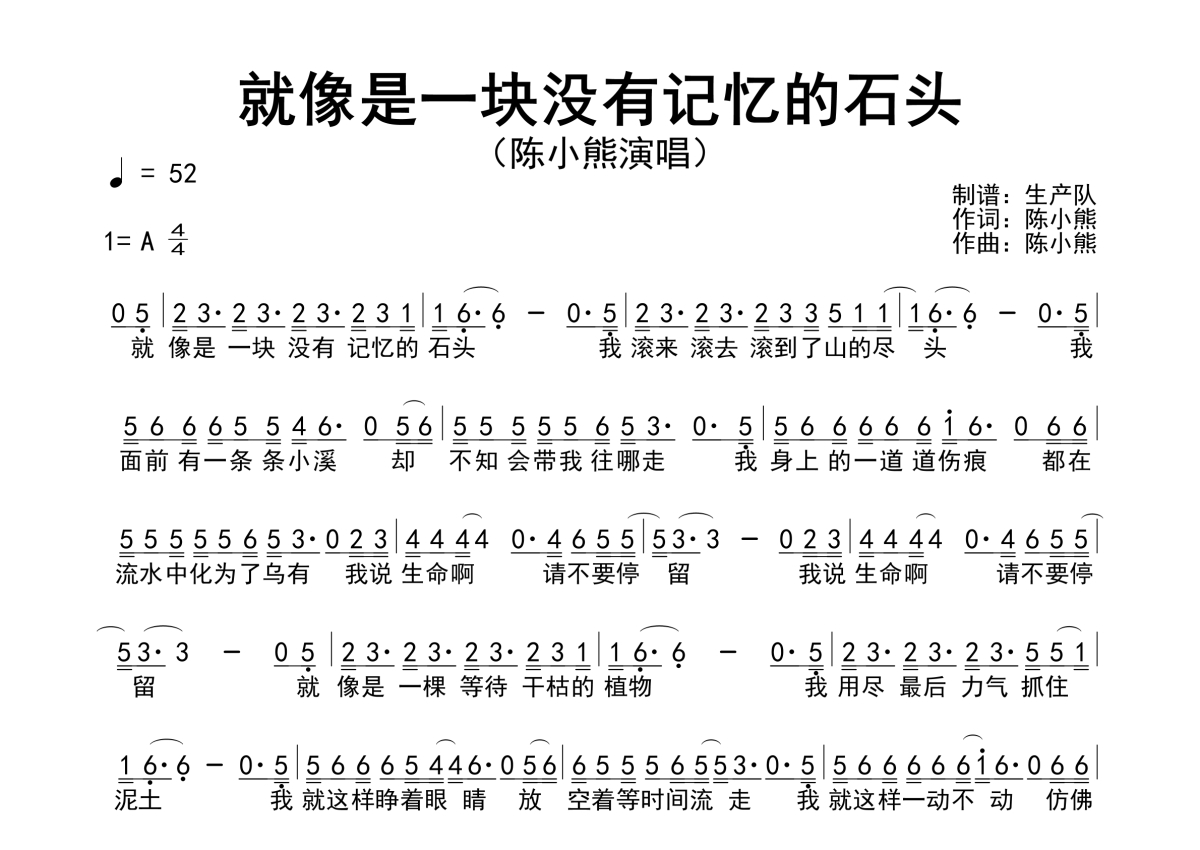 《就像是一块没有记忆的石头》是陈小熊演唱的一首歌曲,简谱,这份简谱共有一张高清图谱,图谱由 @生产队 编配上传陈小熊演唱的歌曲《就像是一块没有记忆的石头》简谱。