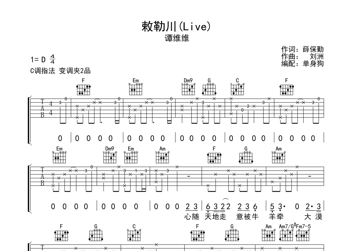 《敕勒川(Live)》是谭维维演唱的一首歌曲,拍号为4/4拍,歌曲原调为D调,但由于原调指法比较难,为了方便弹奏,本吉他谱采用的是C调指法编配,变调夹2品弹奏即为原调,当然也可以根据自己的音域改变变调夹位置,或者通过改变和弦调性,以方便自己弹奏,这份吉他谱共有三张高清图谱,图谱由 @单身狗 编配上传,图谱使用六线谱编配,包含吉他和弦指法、简谱以及歌词部分,使用这份敕勒川(Live)吉他谱,可以让你更加方便地掌握这首歌曲的弹唱技巧,快来尝试吧。