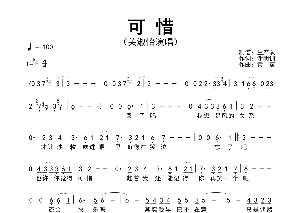 《可惜》是关淑怡演唱的一首歌曲,拍号为4/4拍,歌曲速度为每分钟100拍,这份简谱共有一张高清图谱,图谱由 @生产队 编配上传关淑怡演唱的歌曲《可惜》简谱。