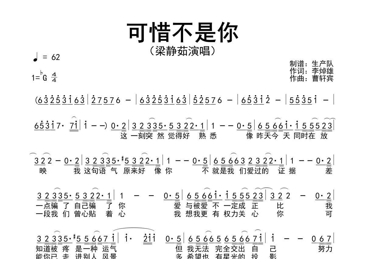 《可惜不是你》是梁静茹演唱的一首歌曲,拍号为4/4拍,歌曲速度为每分钟62拍,这份简谱共有一张高清图谱,图谱由 @生产队 编配上传梁静茹演唱的歌曲《可惜不是你》简谱。