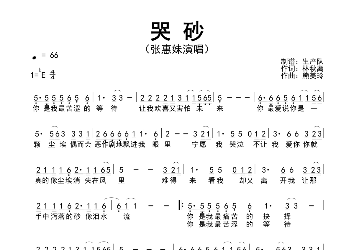 《哭砂》是张惠妹演唱的一首歌曲,拍号为4/4拍,歌曲速度为每分钟66拍,这份简谱共有一张高清图谱,图谱由 @生产队 编配上传张惠妹演唱的歌曲《哭砂》简谱。