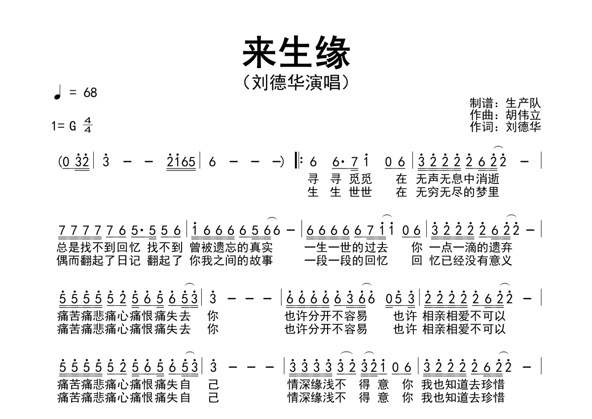 《来生缘》是刘德华演唱的一首歌曲,拍号为4/4拍,歌曲速度为每分钟68拍,这份简谱共有一张高清图谱,图谱由 @生产队 编配上传来生缘演唱的歌曲《刘德华》简谱。