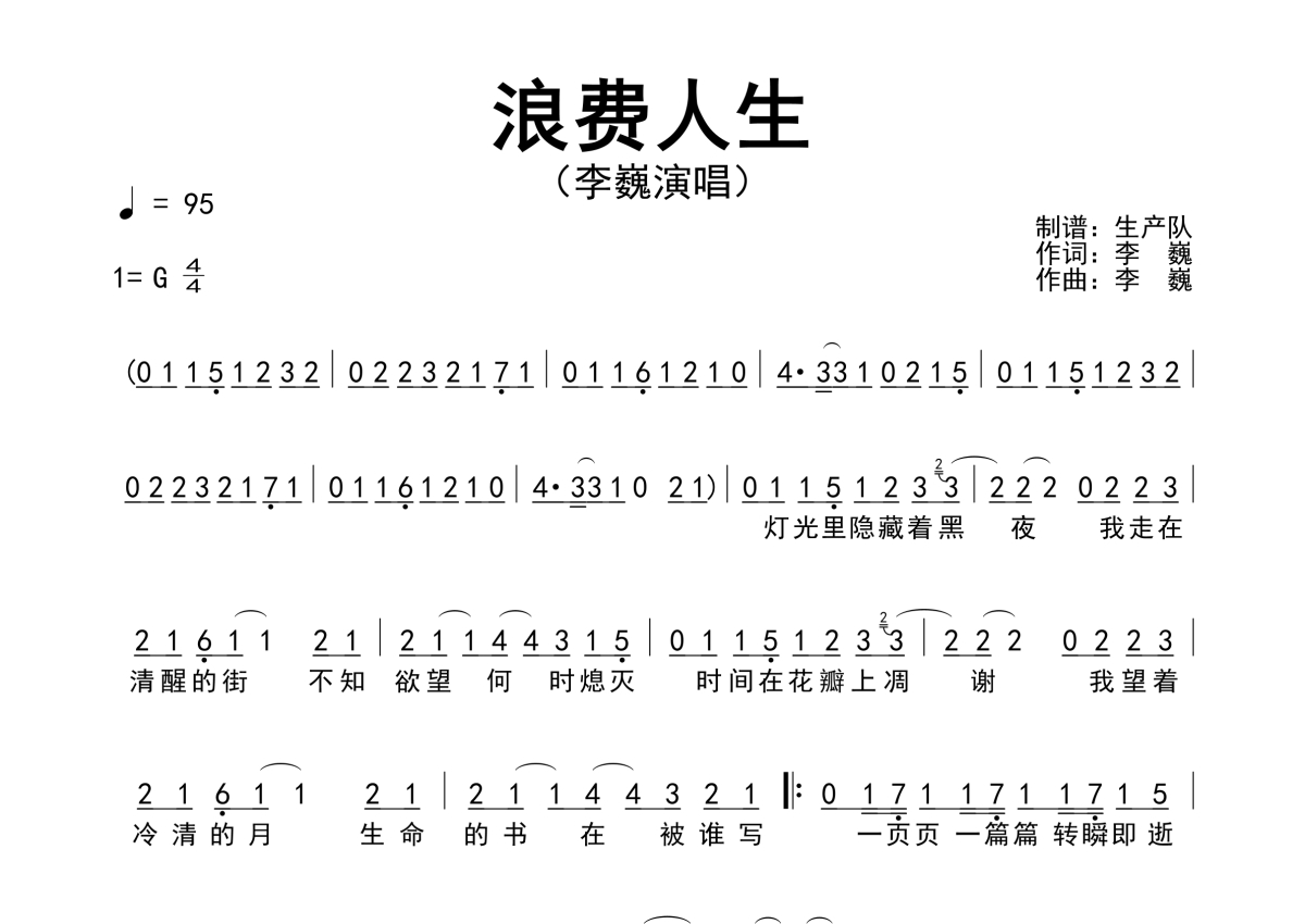 《浪费人生》是李巍演唱的一首歌曲,拍号为4/4拍,歌曲速度为每分钟95拍,这份简谱共有一张高清图谱,图谱由 @生产队 编配上传李巍演唱的歌曲《浪费人生》简谱。