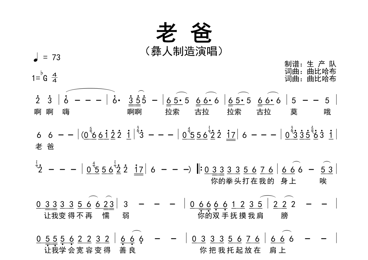 《老爸》是彝人制造演唱的一首歌曲,拍号为4/4拍,歌曲速度为每分钟73拍,这份简谱共有一张高清图谱,图谱由 @生产队 编配上传彝人制造演唱的歌曲《老爸》简谱。
