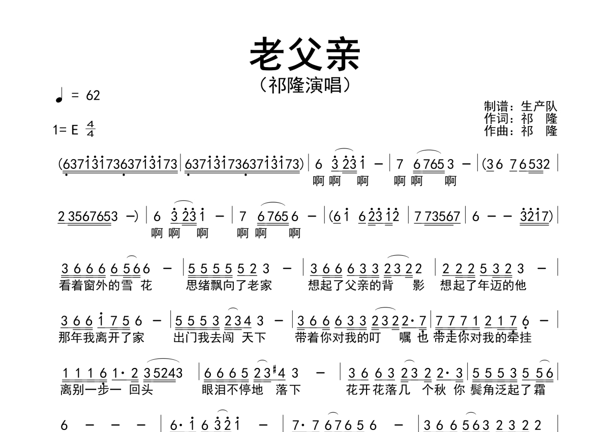 《老父亲》是祁隆演唱的一首歌曲,拍号为4/4拍,歌曲速度为每分钟62拍,这份简谱共有一张高清图谱,图谱由 @生产队 编配上传祁隆演唱的歌曲《老父亲》简谱。