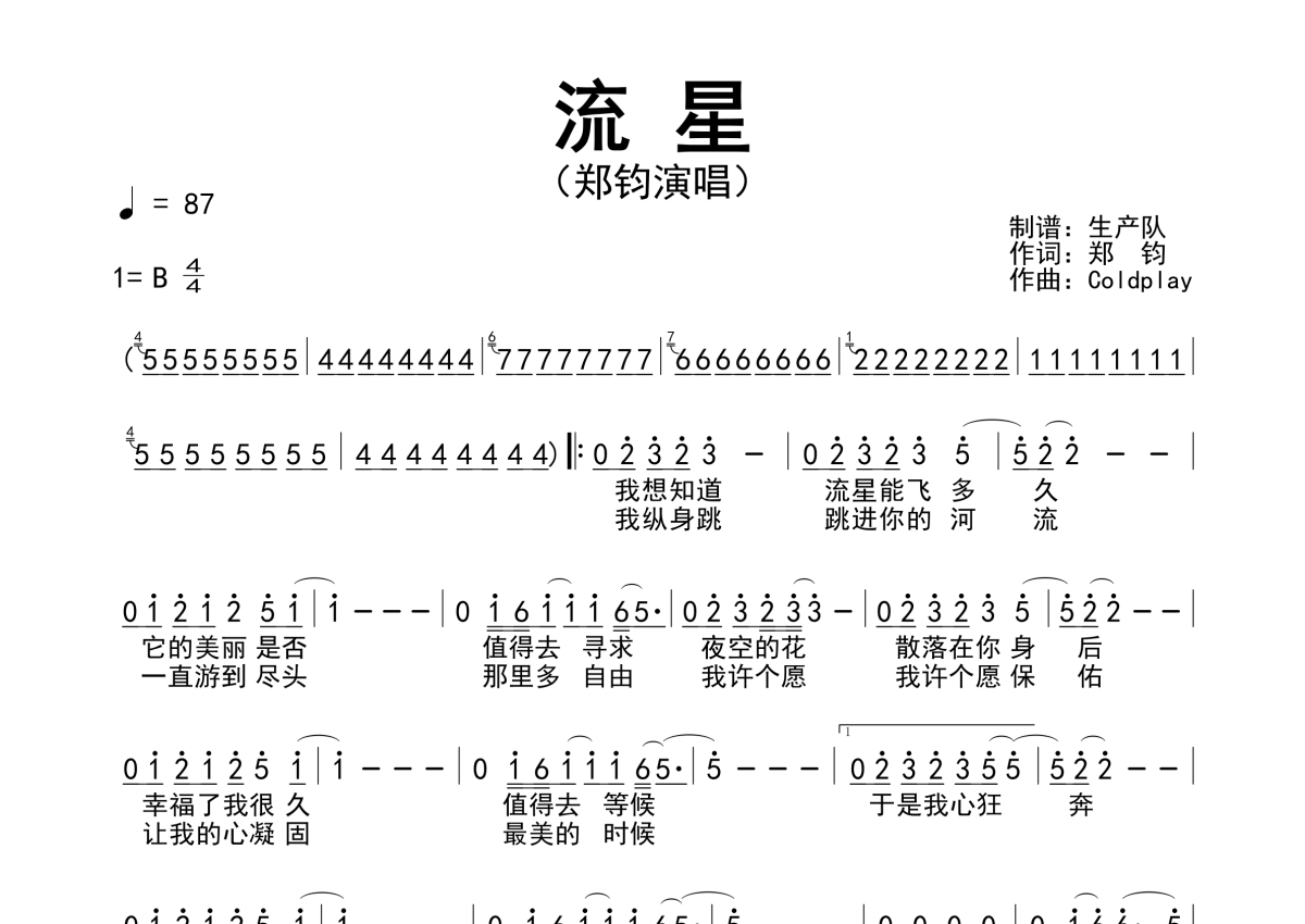 《流星》是郑钧演唱的一首歌曲,拍号为4/4拍,歌曲速度为每分钟87拍,这份简谱共有一张高清图谱,图谱由 @生产队 编配上传郑钧演唱的歌曲《流星》简谱。