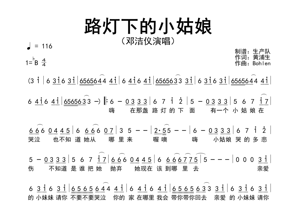《路灯下的小姑娘》是邓洁仪演唱的一首歌曲,拍号为4/4拍,歌曲速度为每分钟116拍,这份简谱共有一张高清图谱,图谱由 @生产队 编配上传邓洁仪演唱的歌曲《路灯下的小姑娘》简谱。