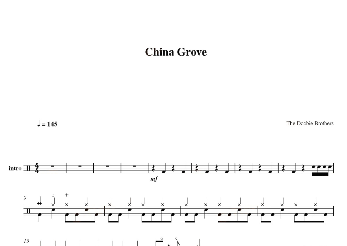 《China grove》是Doobie Brothers演唱的一首歌曲,这份鼓谱共有三张高清图谱,图谱由 @打鼓谱 编配上传,图谱使用五线谱编配,使用这份China grove架子鼓谱,你将能够轻松地敲打出这首Doobie Brothers的China grove,快来尝试吧。《China grove》现场版。