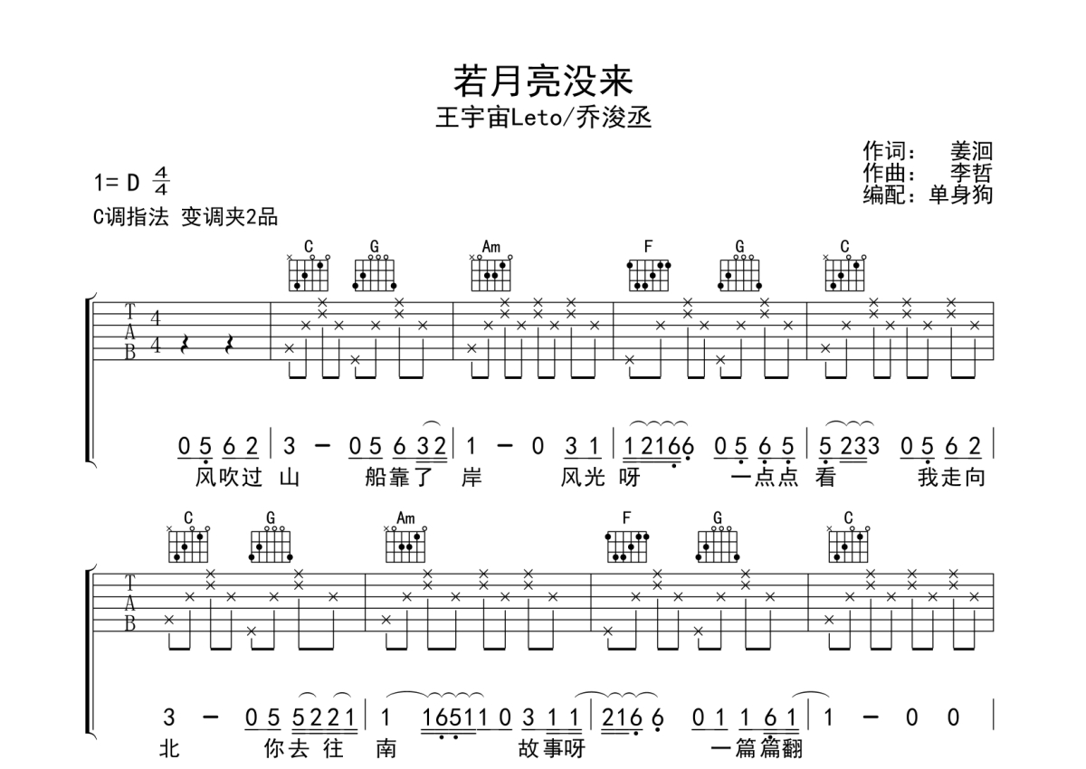 《若月亮没来》是王宇宙/乔浚丞演唱的一首歌曲,拍号为4/4拍,歌曲原调为D调,但由于原调指法比较难,为了方便弹奏,本吉他谱采用的是C调指法编配,变调夹2品弹奏即为原调,当然也可以根据自己的音域改变变调夹位置,或者通过改变和弦调性,以方便自己弹奏,这份吉他谱共有四张高清图谱,图谱由 @单身狗 编配上传,图谱使用六线谱编配,包含吉他和弦指法、简谱以及歌词部分,使用这份若月亮没来吉他谱,可以让你更加方便地掌握这首歌曲的弹唱技巧,快来尝试吧。