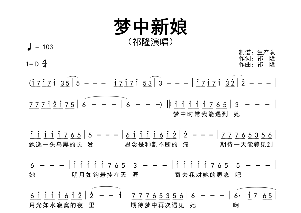 《梦中新娘》是祁隆演唱的一首歌曲,简谱,拍号为4/4拍,歌曲速度为每分钟103拍,这份简谱共有一张高清图谱,图谱由 @生产队 编配上传祁隆演唱的歌曲《梦中新娘》简谱。