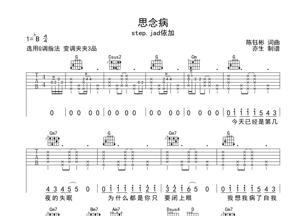 《思念病》是step.jad依加演唱的一首歌曲,拍号为4/4拍,歌曲原调为Bb调,但由于原调指法比较难,为了方便弹奏,本吉他谱采用的是G调指法编配,变调夹3品弹奏即为原调,当然也可以根据自己的音域改变变调夹位置,或者通过改变和弦调性,以方便自己弹奏,这份吉他谱共有三张高清图谱,图谱由 @亦生 编配上传,图谱使用六线谱编配,包含吉他和弦指法、简谱以及歌词部分,使用这份思念病吉他谱,可以让你更加方便地掌握这首歌曲的弹唱技巧,快来尝试吧。