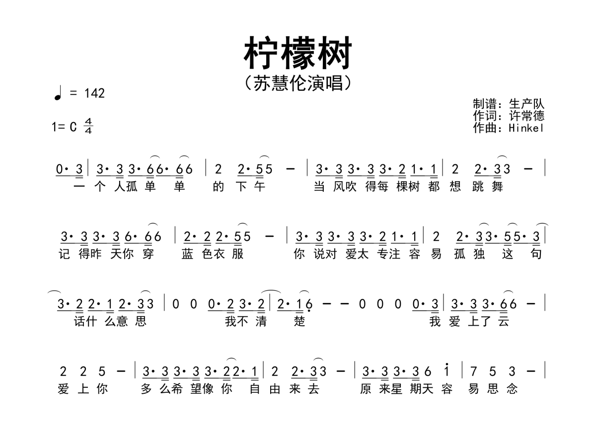 《柠檬树》是苏慧伦演唱的一首歌曲,拍号为4/4拍,歌曲速度为每分钟142拍,这份简谱共有两张高清图谱,图谱由 @生产队 编配上传苏慧伦演唱的歌曲《柠檬树》简谱。