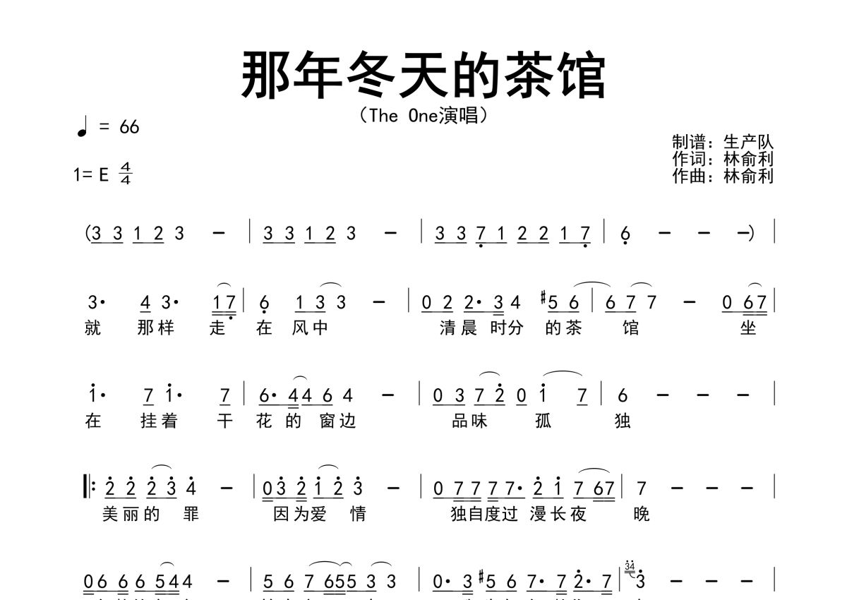 《那年冬天的茶馆》是The One演唱的一首歌曲,拍号为4/4拍,歌曲速度为每分钟66拍,这份简谱共有一张高清图谱,图谱由 @生产队 编配上传The One演唱的歌曲《那年冬天的茶馆》(中文版)简谱。