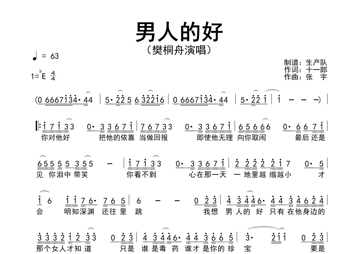 《男人的好》是樊桐舟演唱的一首歌曲,拍号为4/4拍,歌曲速度为每分钟63拍,这份简谱共有一张高清图谱,图谱由 @生产队 编配上传樊桐舟演唱的歌曲《男人的好》简谱。
