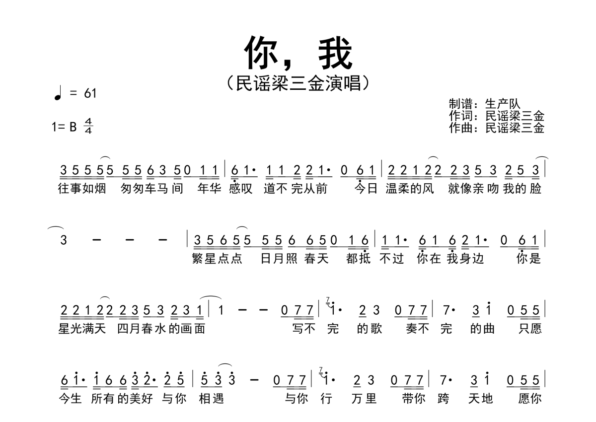 《你,我》是民谣梁三金演唱的一首歌曲,拍号为4/4拍,歌曲速度为每分钟61拍,这份简谱共有一张高清图谱,图谱由 @生产队 编配上传民谣梁三金演唱的歌曲《你,我》简谱。