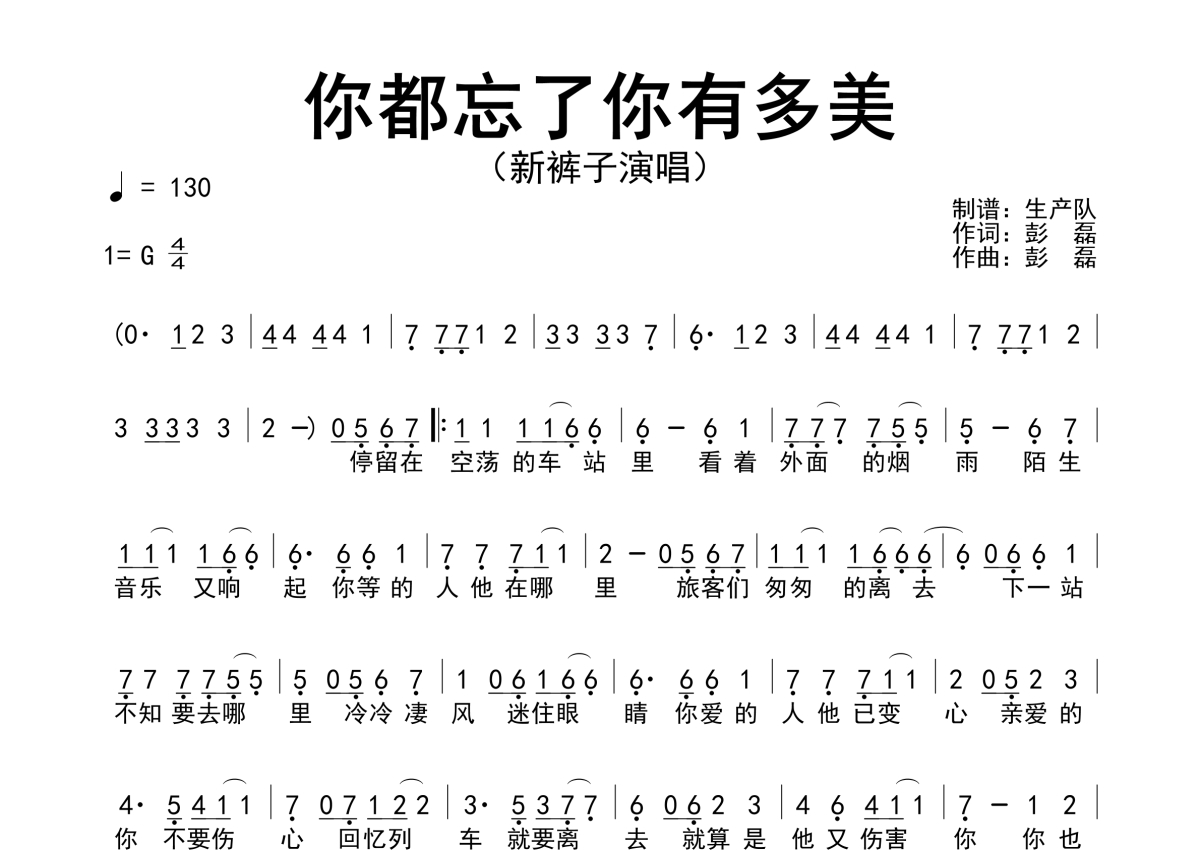 《你都忘了你有多美》是新裤子乐队演唱的一首歌曲,拍号为4/4拍,歌曲速度为每分钟130拍,这份简谱共有一张高清图谱,图谱由 @生产队 编配上传新裤子演唱的歌曲《你都忘了你有多美》简谱。
