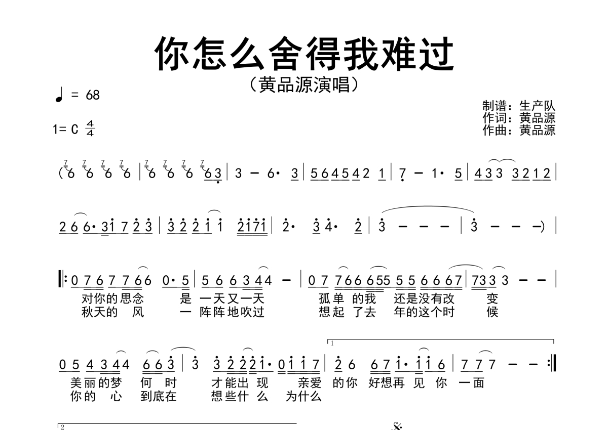 《你怎么舍得我难过》是黄品源演唱的一首歌曲,拍号为4/4拍,歌曲速度为每分钟68拍,这份简谱共有一张高清图谱,图谱由 @生产队 编配上传黄品源演唱的歌曲《你怎么舍得我难过》简谱。