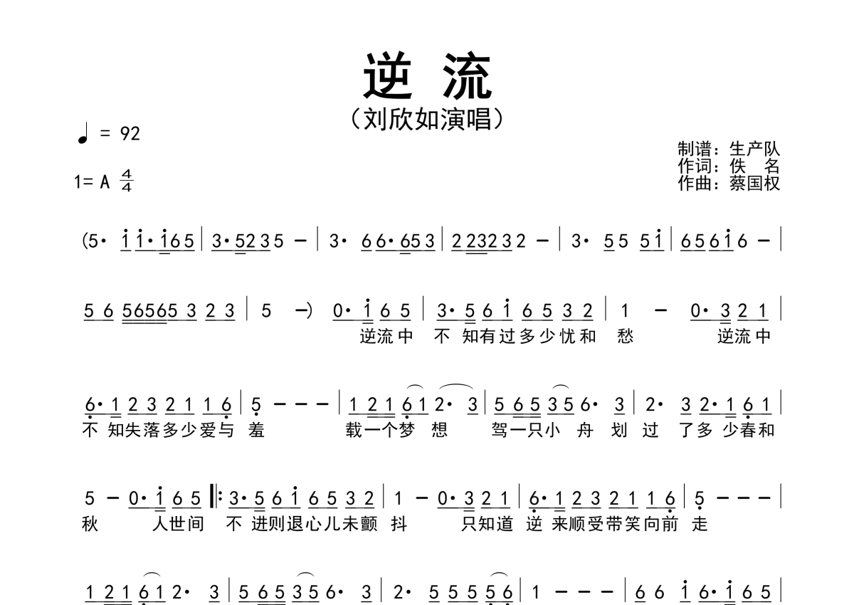 《逆流》是刘欣如演唱的一首歌曲,拍号为4/4拍,歌曲速度为每分钟92拍,这份简谱共有一张高清图谱,图谱由 @生产队 编配上传刘欣如演唱的歌曲《逆流》简谱。