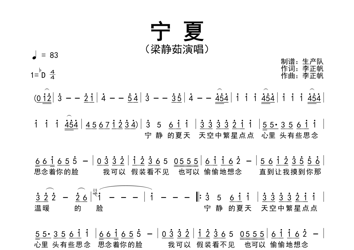 《宁夏》是梁静茹演唱的一首歌曲,拍号为4/4拍,歌曲速度为每分钟83拍,这份简谱共有一张高清图谱,图谱由 @生产队 编配上传梁静茹演唱的歌曲《宁夏》简谱。