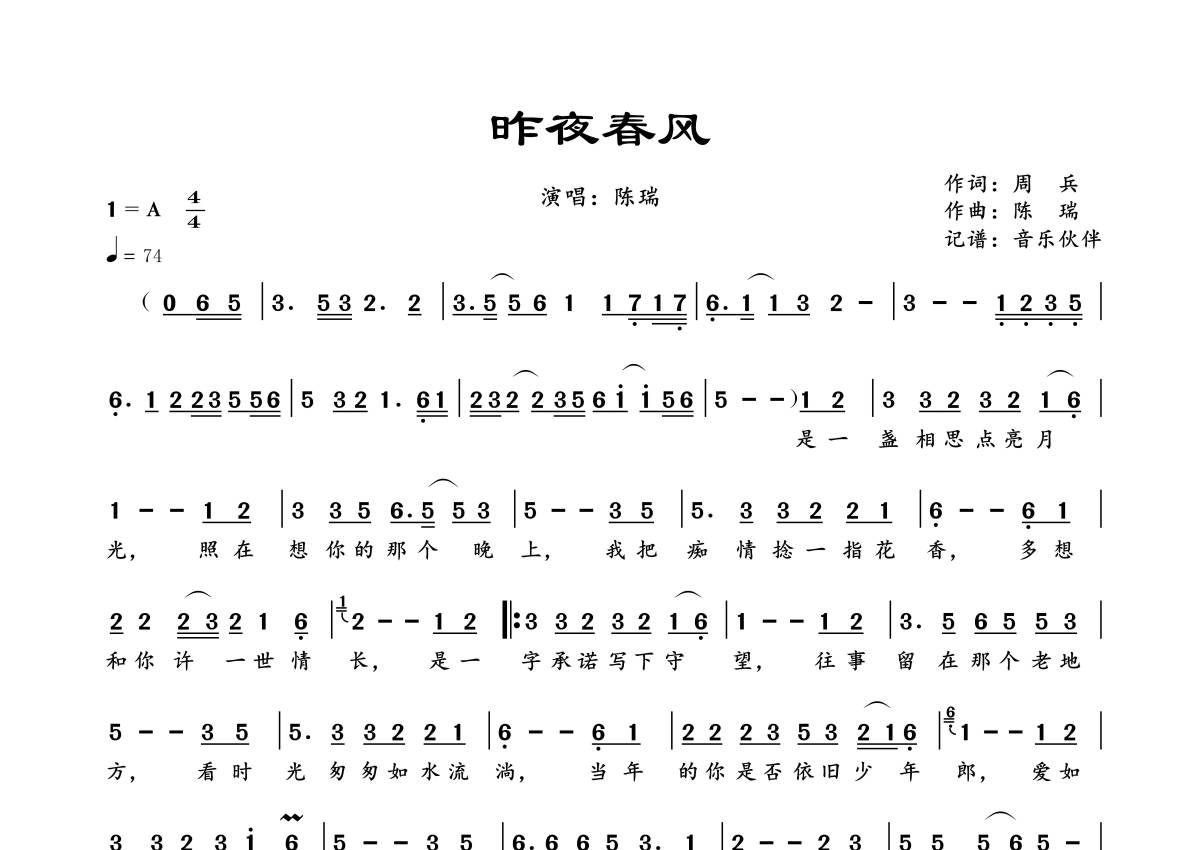 《昨夜春风》是陈瑞演唱的一首歌曲,拍号为4/4拍,歌曲速度为每分钟74拍,这份简谱共有一张高清图谱,图谱由 @音乐伙伴 编配上传。