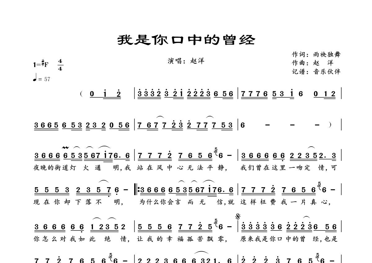 《我是你口中的曾经》是赵洋演唱的一首歌曲,拍号为4/4拍,歌曲速度为每分钟57拍,这份简谱共有一张高清图谱,图谱由 @音乐伙伴 编配上传。