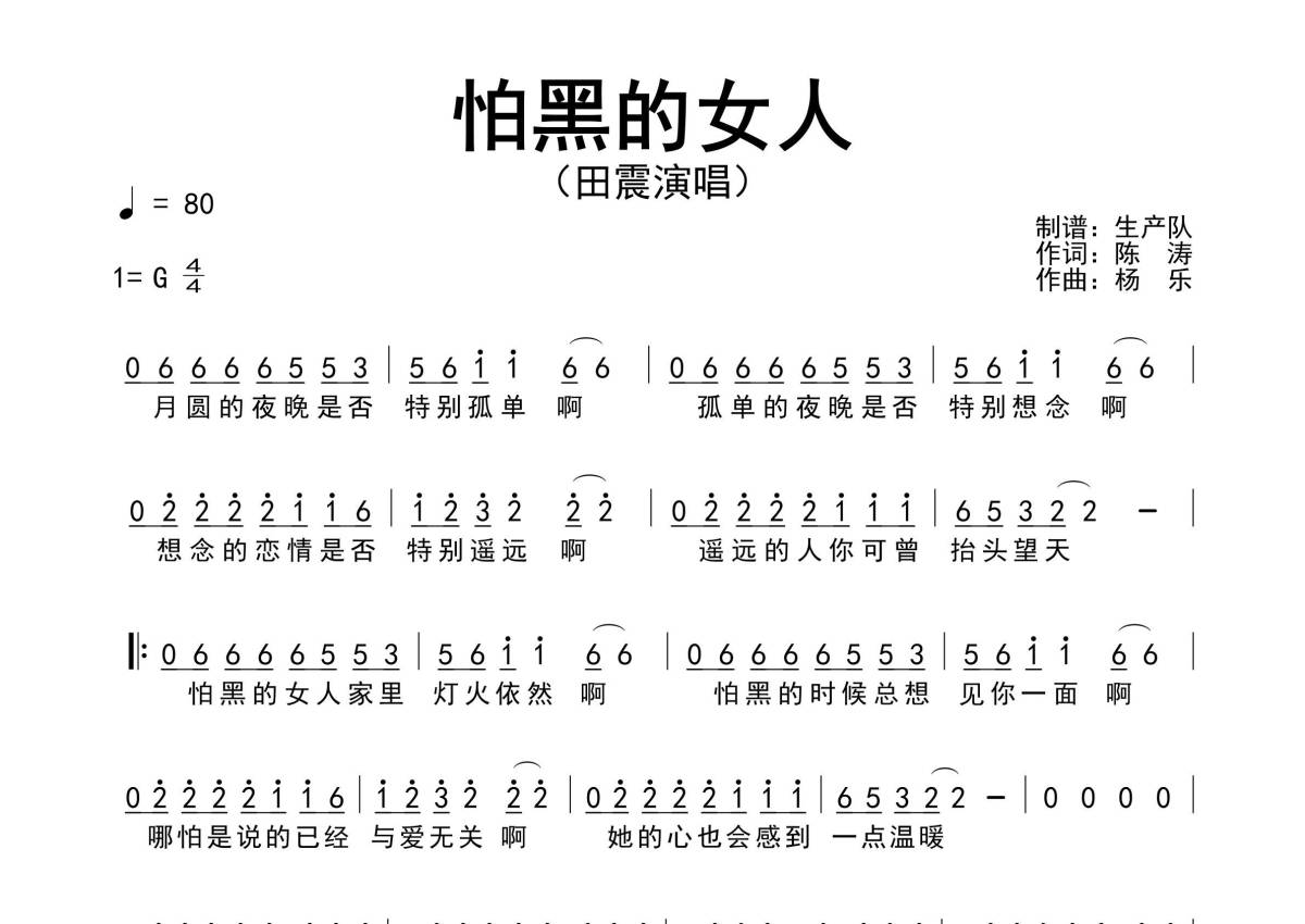 《怕黑的女人》是田震演唱的一首歌曲,简谱,拍号为4/4拍,歌曲速度为每分钟80拍,这份简谱共有一张高清图谱,图谱由 @生产队 编配上传田震演唱的歌曲《怕黑的女人》简谱。