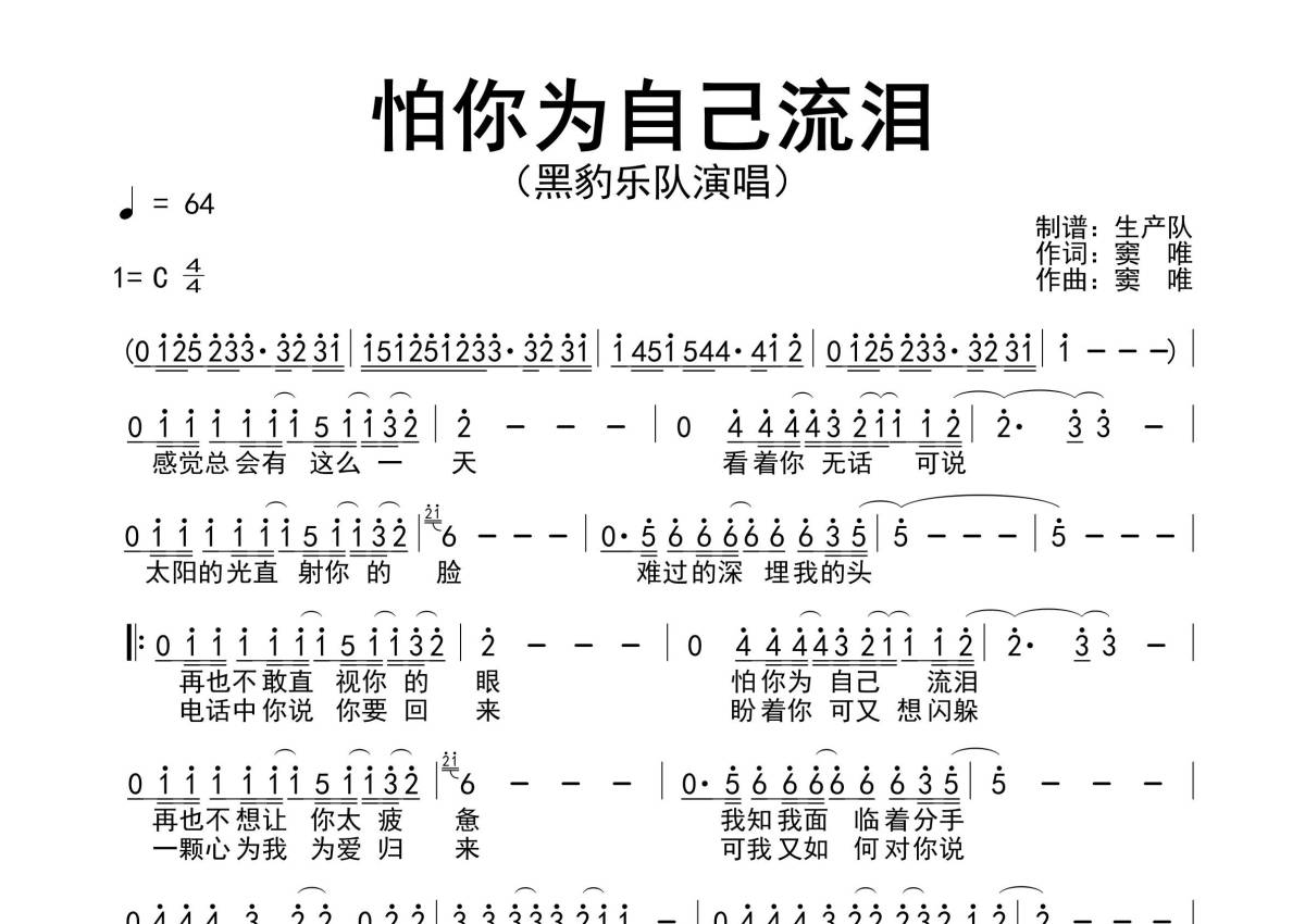 《怕你为自己流泪》是黑豹乐队演唱的一首歌曲,简谱,拍号为4/4拍,歌曲速度为每分钟64拍,这份简谱共有一张高清图谱,图谱由 @生产队 编配上传黑豹乐队演唱的歌曲《怕你为自己流泪》简谱。