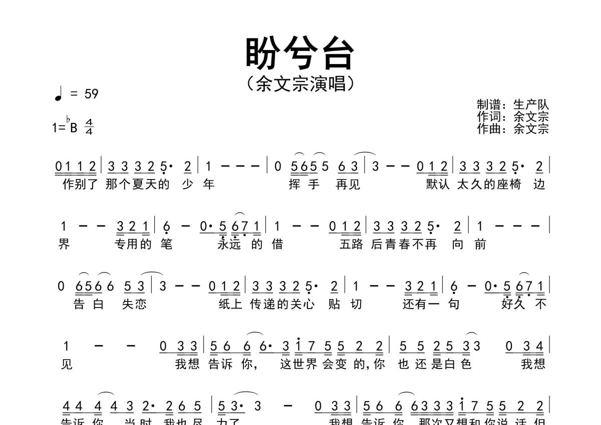 《盼兮台》是余文宗演唱的一首歌曲,简谱,拍号为4/4拍,歌曲速度为每分钟59拍,这份简谱共有一张高清图谱,图谱由 @生产队 编配上传余文宗演唱的歌曲《盼兮台》简谱。