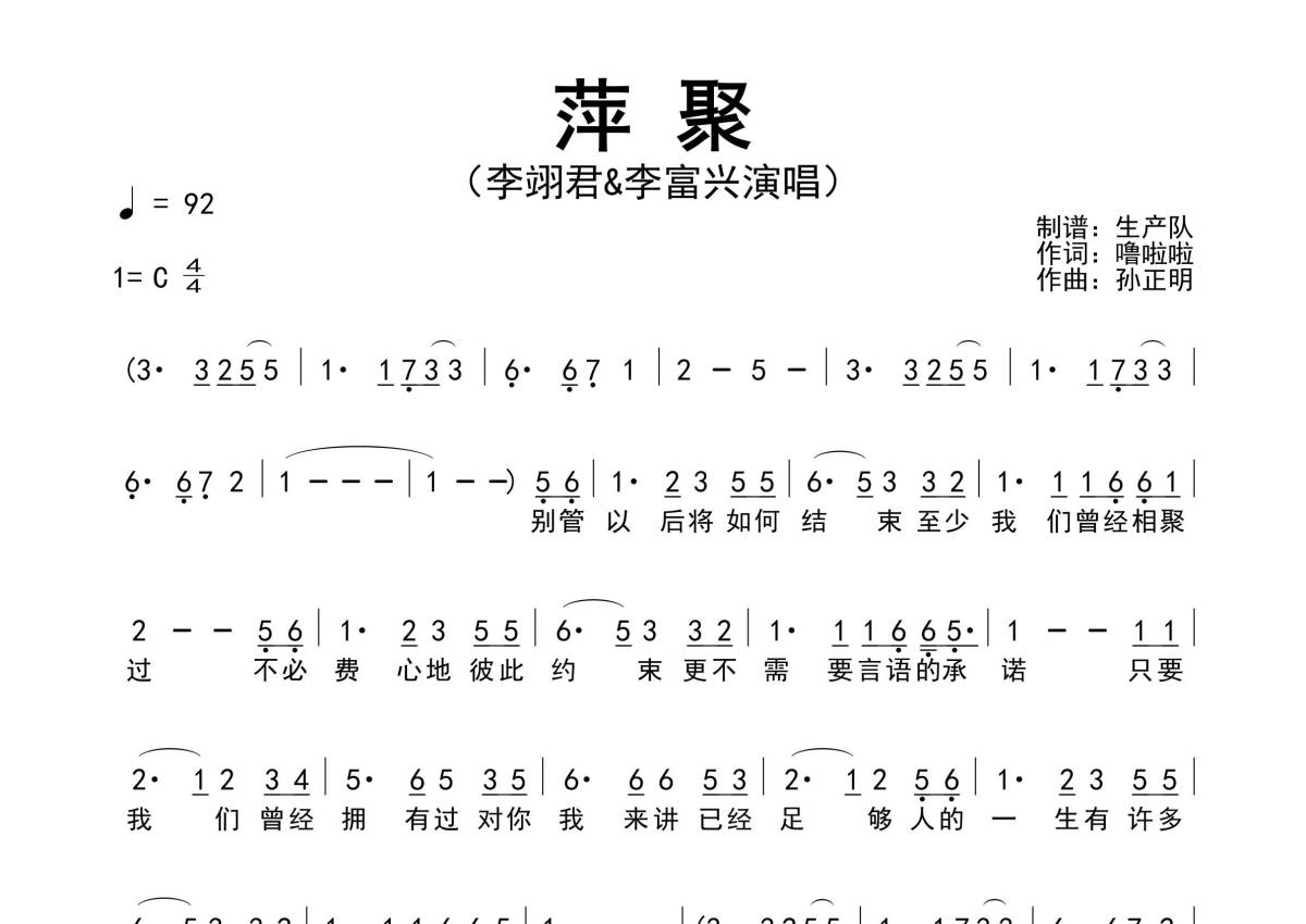 《萍聚》是李翊君/李富兴演唱的一首歌曲,简谱,拍号为4/4拍,歌曲速度为每分钟92拍,这份简谱共有一张高清图谱,图谱由 @生产队 编配上传李翊君/李富兴演唱的歌曲《萍聚》简谱。