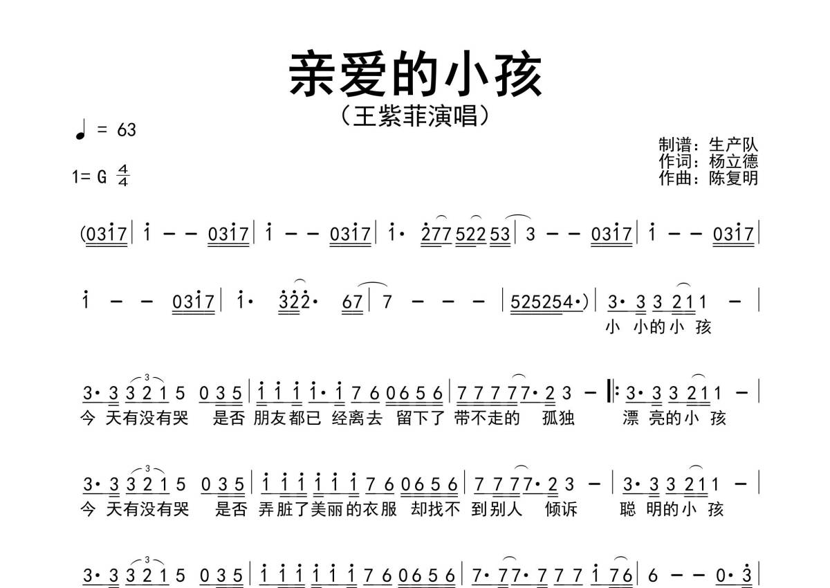 《亲爱的小孩》是王紫菲演唱的一首歌曲,简谱,拍号为4/4拍,歌曲速度为每分钟63拍,这份简谱共有一张高清图谱,图谱由 @生产队 编配上传王紫菲演唱的歌曲《亲爱的小孩》简谱。