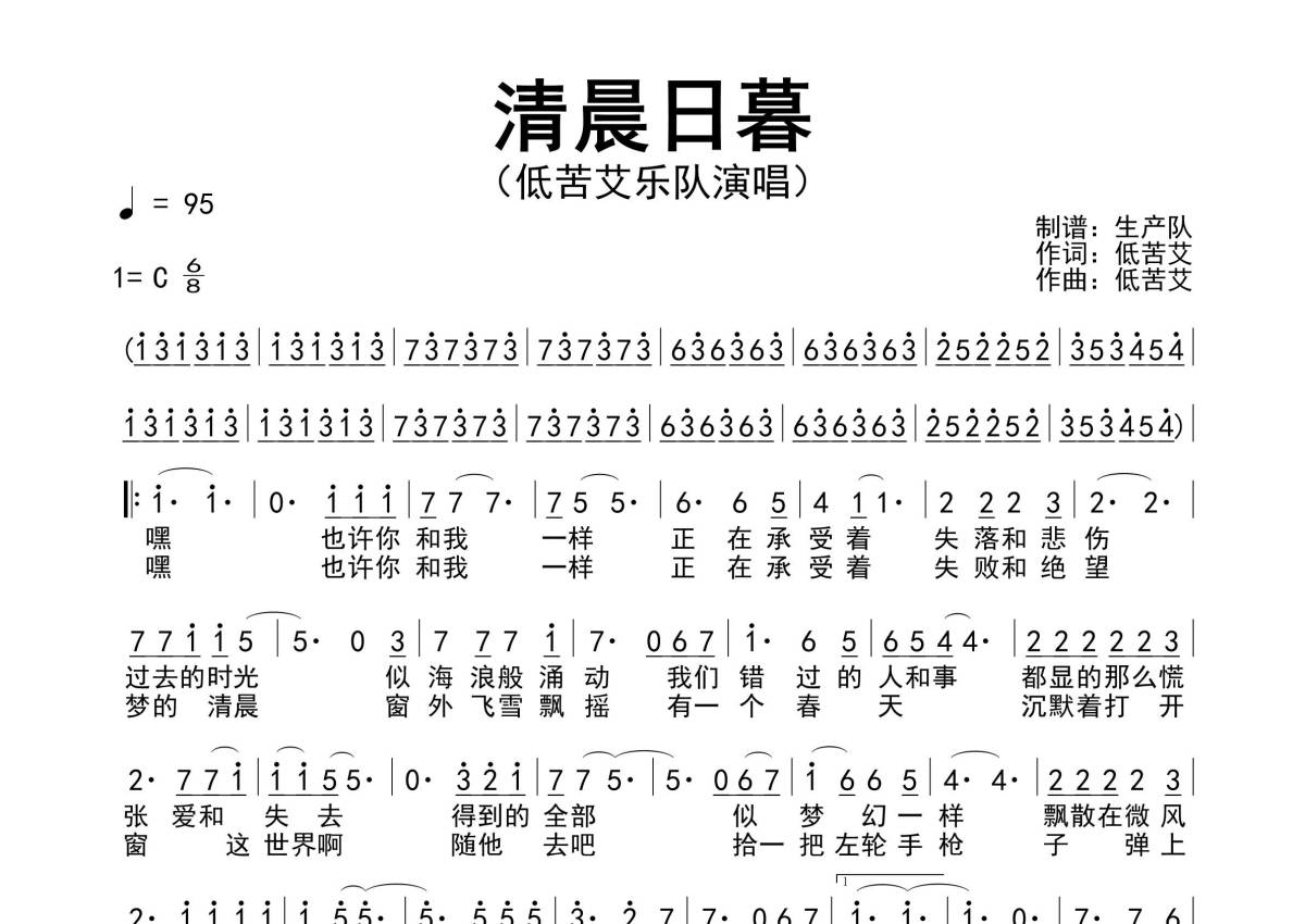 《清晨日暮》是低苦艾乐队演唱的一首歌曲,简谱,拍号为6/8拍,歌曲速度为每分钟95拍,这份简谱共有一张高清图谱,图谱由 @生产队 编配上传低苦艾乐队演唱的歌曲《清晨日暮》简谱。