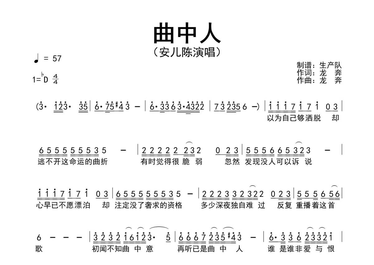 《曲中人》是安儿陈演唱的一首歌曲,简谱,拍号为4/4拍,歌曲速度为每分钟57拍,这份简谱共有一张高清图谱,图谱由 @生产队 编配上传安儿陈演唱的歌曲《曲中人》简谱。