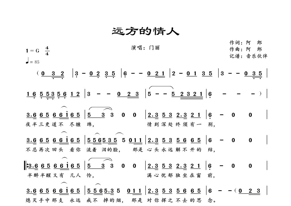 《远方的情人》是门丽演唱的一首歌曲,拍号为4/4拍,歌曲速度为每分钟85拍,这份简谱共有一张高清图谱,图谱由 @音乐伙伴 编配上传。