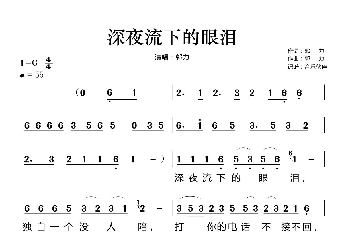《深夜流下的眼泪》是郭力演唱的一首歌曲,这份简谱共有两张高清图谱,图谱由 @音乐伙伴 编配上传。