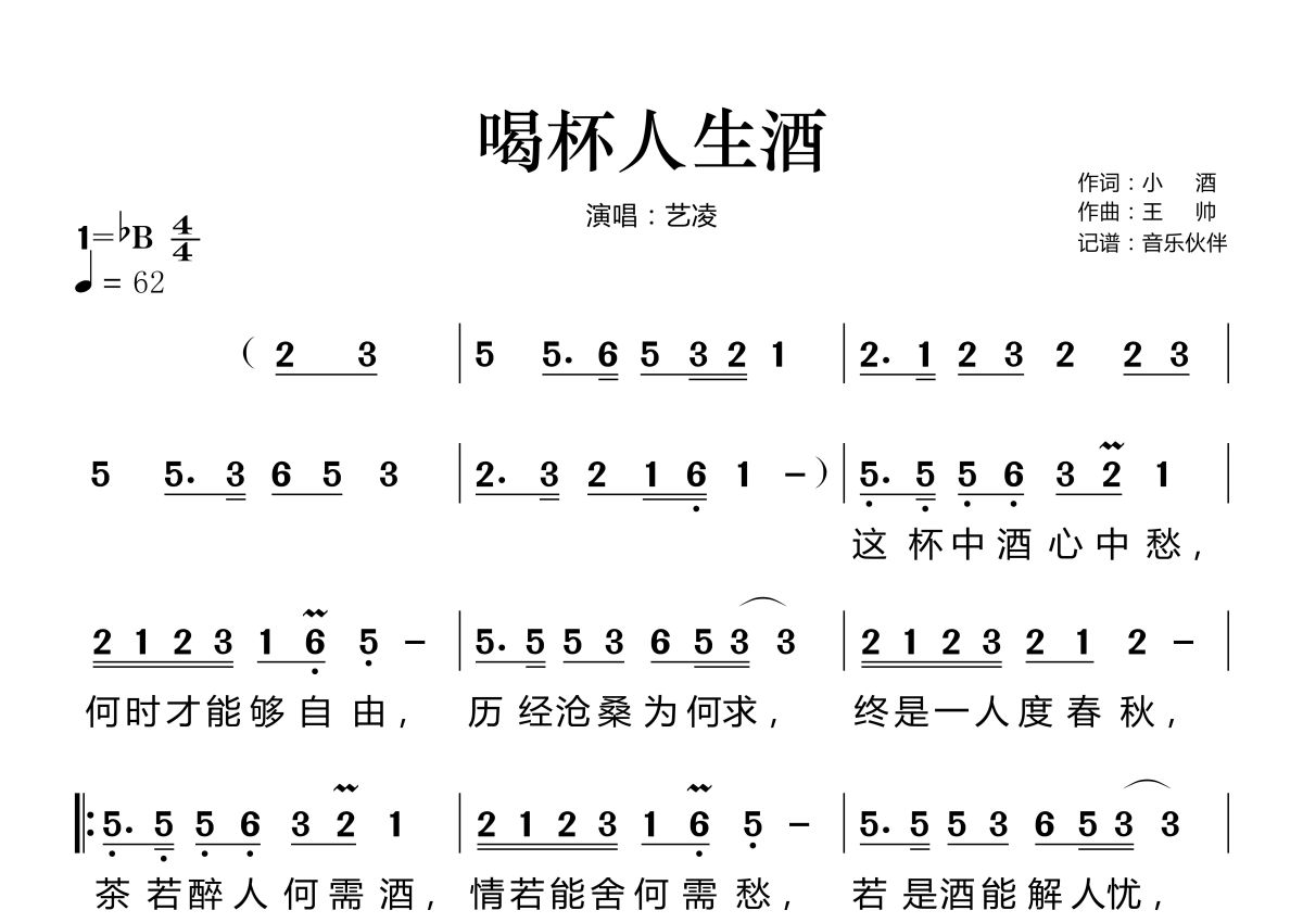 《喝杯人生酒》是艺凌演唱的一首歌曲,这份简谱共有两张高清图谱,图谱由 @音乐伙伴 编配上传。