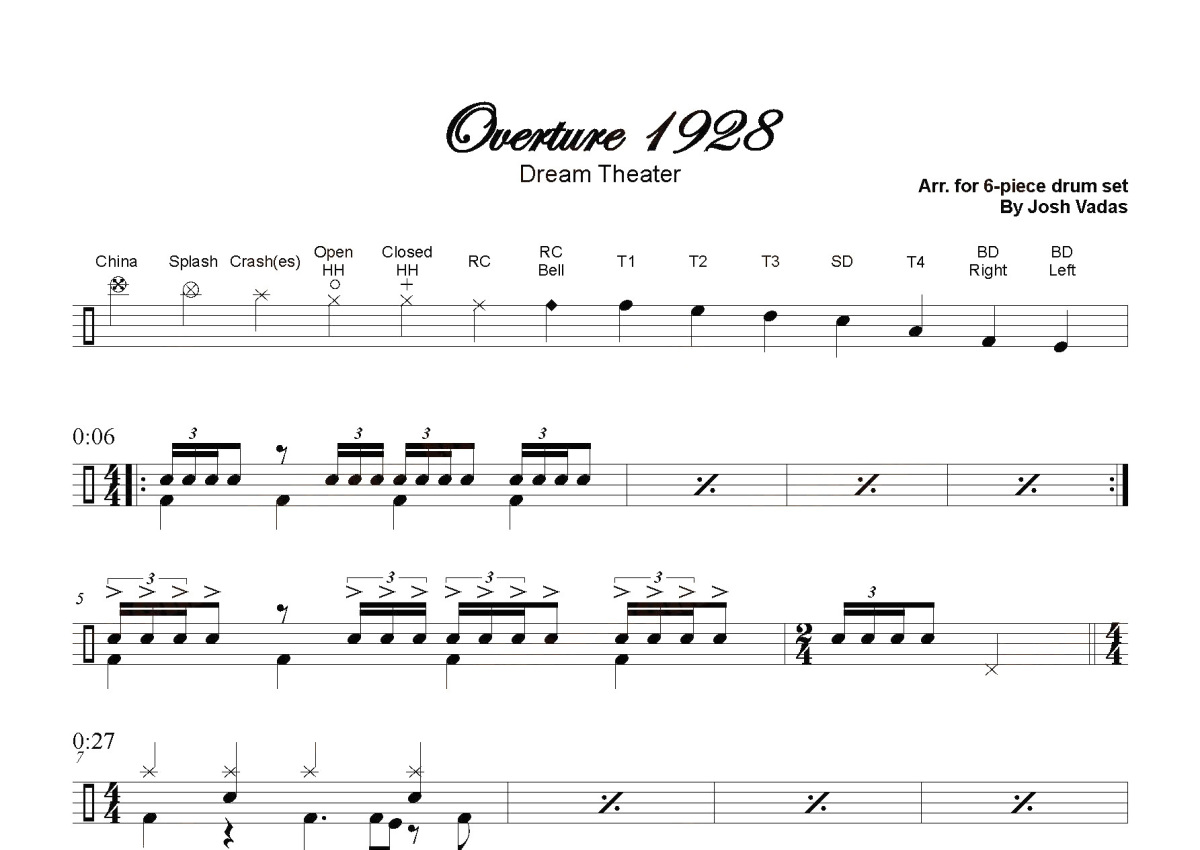 《overture 1928》是Dream Theater演唱的一首歌曲,这份鼓谱共有四张高清图谱,图谱由 @打鼓谱 编配上传,图谱使用五线谱编配,使用这份overture 1928架子鼓谱,你将能够轻松地敲打出这首Dream Theater的overture 1928,快来尝试吧。《overture 1928》现场版。《梦剧场》(Dream Theater)是一个成立于美国波士顿的前卫金属乐团,由几位“Berklee音乐学院”的在学学生在1985年组成(Majesty,梦剧场乐团的前身)。