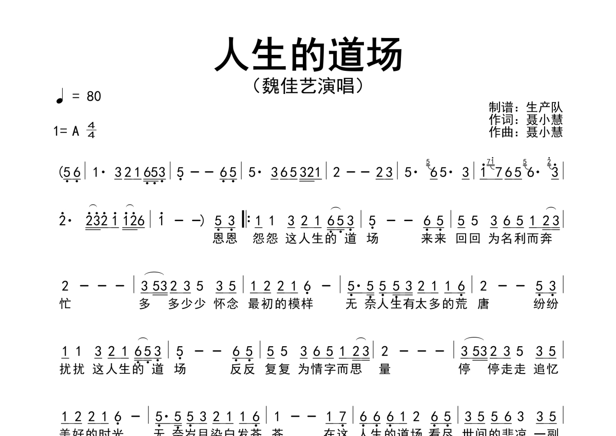 《人生的道场》是魏佳艺演唱的一首歌曲,简谱,拍号为4/4拍,歌曲速度为每分钟80拍,这份简谱共有一张高清图谱,图谱由 @生产队 编配上传魏佳艺演唱的歌曲《人生的道场》简谱。