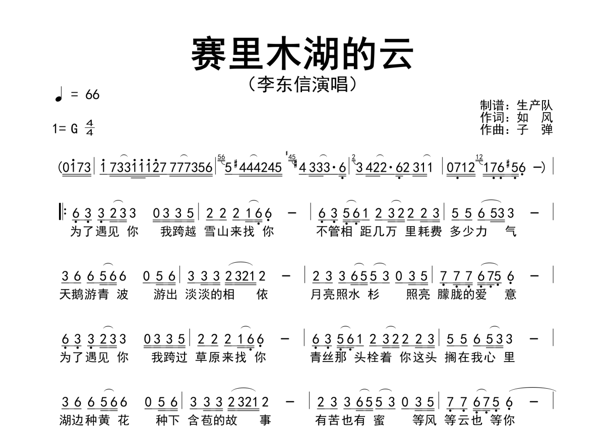 《赛里木湖的云》是李东信演唱的一首歌曲,简谱,拍号为4/4拍,歌曲速度为每分钟66拍,这份简谱共有一张高清图谱,图谱由 @生产队 编配上传李东信演唱的歌曲《赛里木湖的云》简谱。