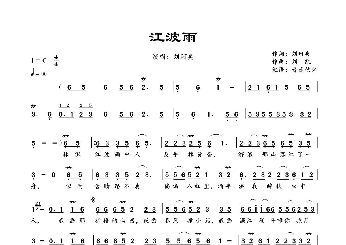《江波雨》是刘珂矣演唱的一首歌曲,拍号为4/4拍,歌曲速度为每分钟66拍,这份简谱共有一张高清图谱,图谱由 @音乐伙伴 编配上传。