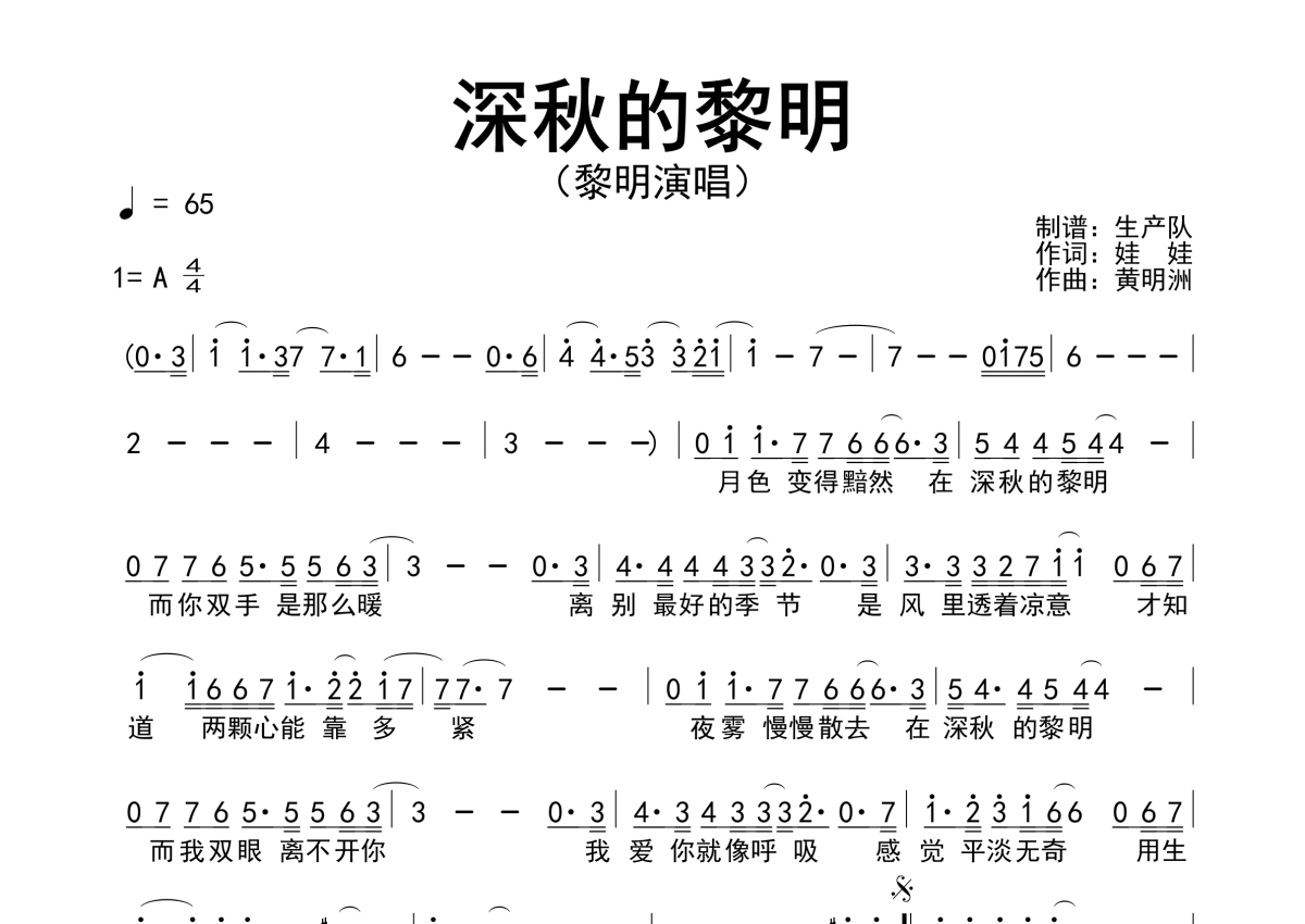 《深秋的黎明》是黎明演唱的一首歌曲,简谱,拍号为4/4拍,歌曲速度为每分钟65拍,这份简谱共有一张高清图谱,图谱由 @生产队 编配上传黎明演唱的歌曲《深秋的黎明》简谱。